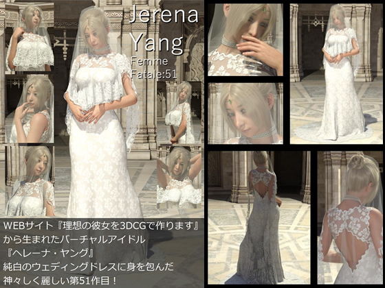 WEBサイト『理想の彼女を3DCGで作ります』から生まれた写実的ヴァーチャルアイドル女優「ヘレーナ・ヤング」の51th写真集です。表紙を含めて全61ページです。金髪&スレンダー&巨乳、華僑系の父親と北欧系の母親のハーフであるアジアン&ヨーロピアンを兼ね備えたビューティである彼女の肢体を沢山収めています。大元の画像が横1820×縦2570ピクセルのため、作品本体はPDFですがかなりの拡大に耐えます。今回は、純白のウェディングドレスに身を包んだ神々しくすらある彼女の姿を収めました。お楽しみ下さい。 -