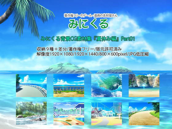 夏休み編背景素材9点+差分を入れた、お得なおまとめパックです。 同人、商業問わずご利用頂けます。 夏休みやバカンス向け素材です。 アドベンチャーゲーム、漫画などに是非お使いください。 キャラクターが生きる舞台を是非貴方に♪ --------------------------- 背景素材 販売形式:jpg形式 解像度:1920×1440pixel・1920×1080pixel・800×600pixel/JPG低圧縮 販売形式:ダウンロード販売 --------------------------- -