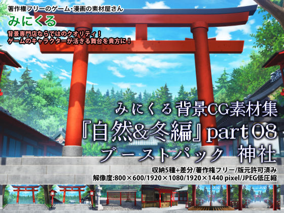 神社のアングル違い素材5点+差分を入れた、お得なおまとめパックです。 同人、商業問わずご利用頂けます。 初詣や新年の作品に使える神社の背景素材です。 鳥居や絵馬や拝殿寄り構図など新年に便利な素材が収録されています。 夜の差分や雪の差分では怪しげな雰囲気の神社としても◎ 参拝構図ではキャラが挟めるPNG透過素材も同封しております。 ──────── みにくる背景CG素材集『自然&冬編』part08に収録されている 神社のアングル替え素材と時間差分を収録した素材集です。 『自然&冬編』part08をお持ちでない方にもお使い頂けます。 ──────── ゲーム・動画・漫画・イラスト・TRPGなどに是非お使いください。 キャラクターが生きる舞台を是非貴方に♪ 同梱されておりますご利用規定に沿ってご利用ください。 --------------------------- 背景素材 販売形式:jpg形式,png形式 解像度:1920×1440pixel・1920×1080pixel・800×600pixel 販売形式:ダウンロード販売 --------------------------- -