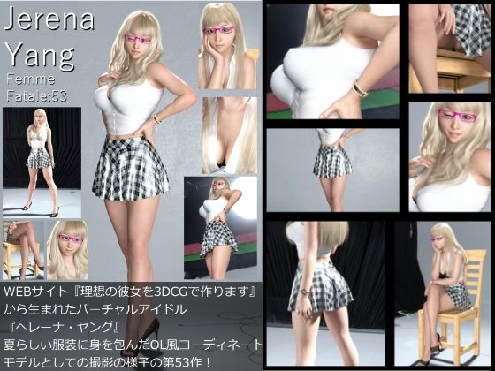 WEBサイト『理想の彼女を3DCGで作ります』から生まれた写実的ヴァーチャルアイドル女優「ヘレーナ・ヤング」の53th写真集です。表紙を含めて全65ページです。金髪&スレンダー&巨乳、華僑系の父親と北欧系の母親のハーフであるアジアン&ヨーロピアンを兼ね備えたビューティである彼女の肢体を沢山収めています。大元の画像が横1820×縦2570ピクセルのため、作品本体はPDFですがかなりの拡大に耐えます。今回は、夏らしい肉食OL風の露出度高めのコーディネートでのモデル撮影風景を収めております。